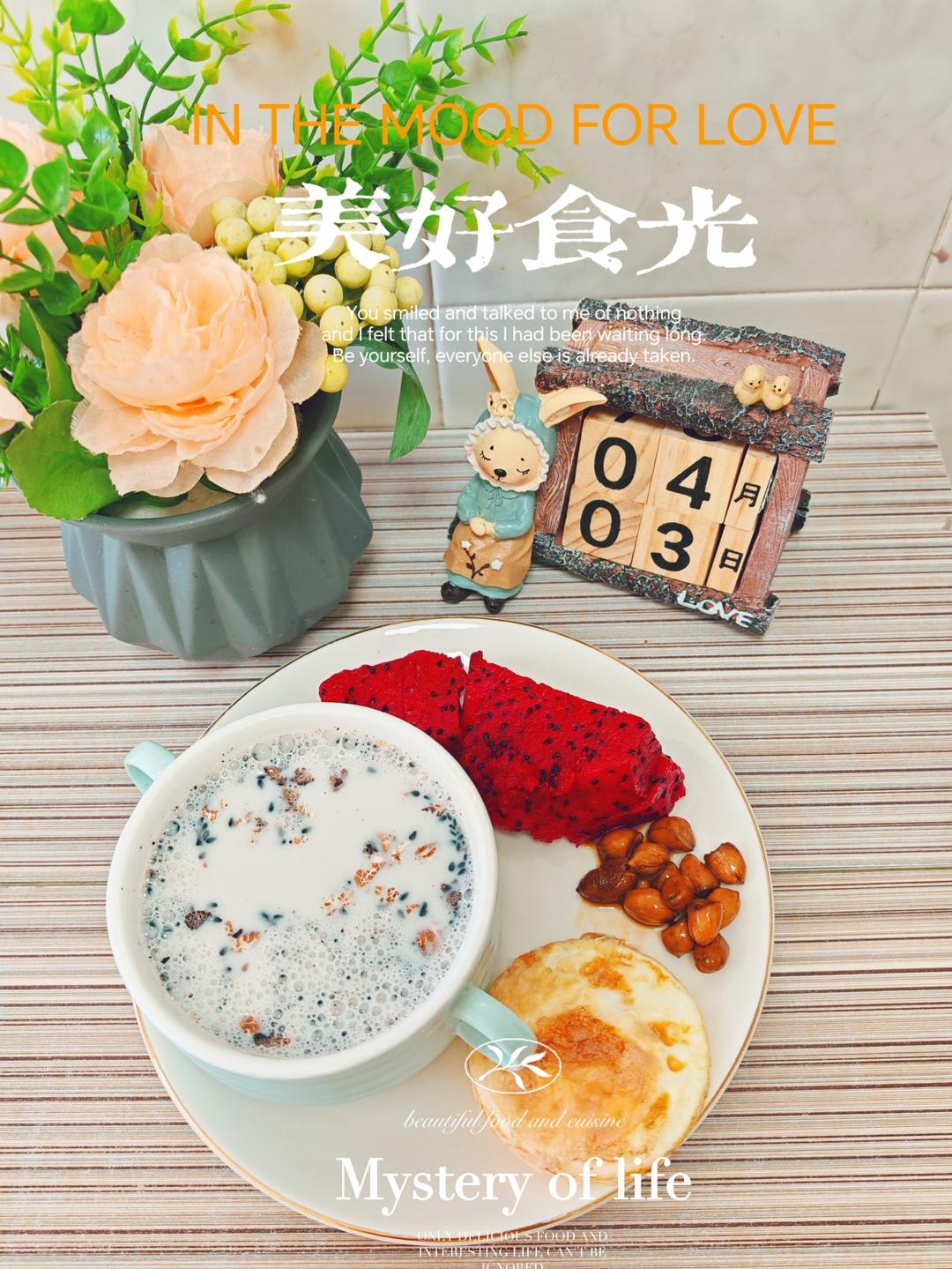 4.3早餐日记: 燕麦+脱脂牛奶+火龙果+醋泡花生+水煮蛋