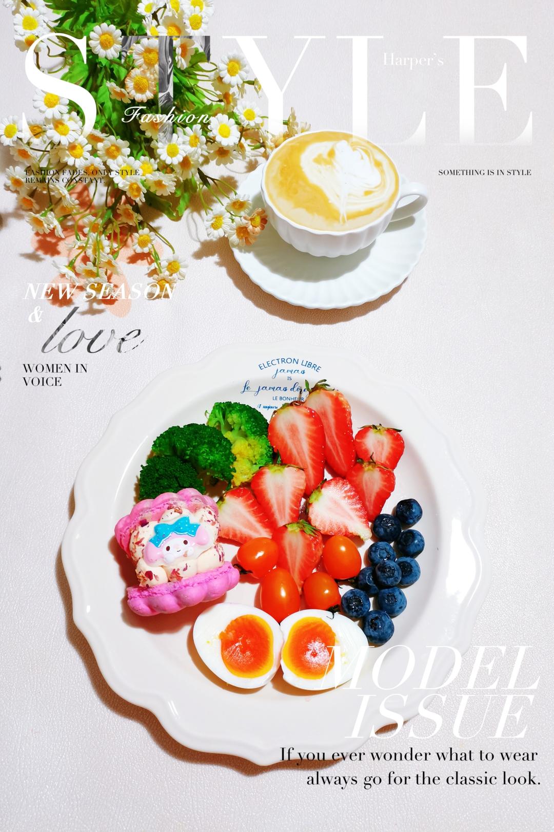 美乐蒂马卡龙 水煮蛋 西兰花🥦 草莓🍓 黄樱柿 蓝莓🫐 拿铁咖啡☕️