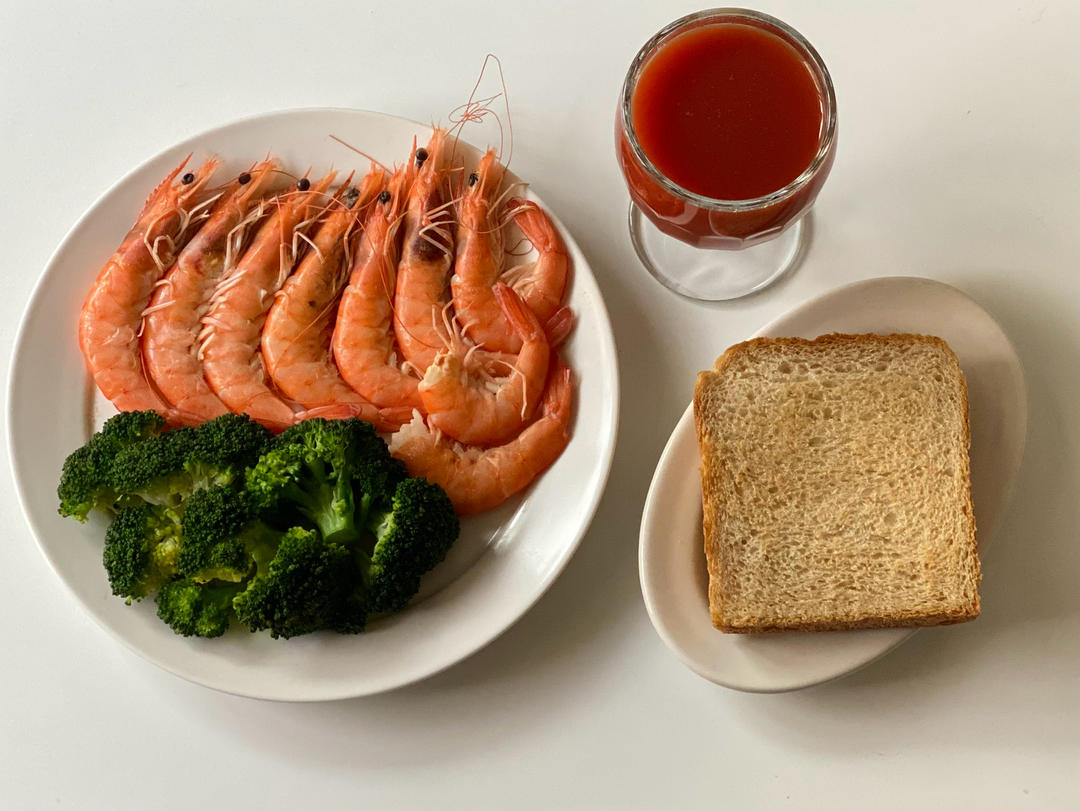 🈶:白灼虾&西兰花、50%全麦吐司、番茄汁