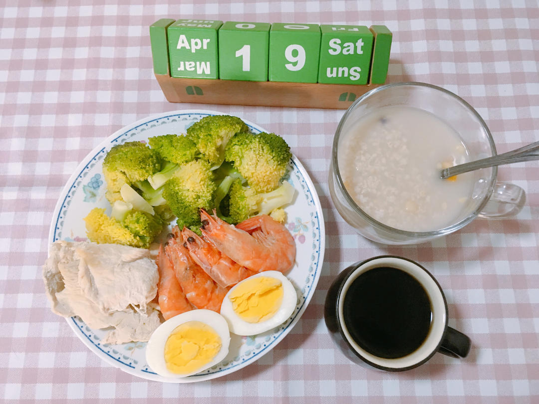 白煮鸡胸肉+白煮蛋🥚+白灼虾🦐+西蓝花🥦+果蔬麦片+咖啡☕