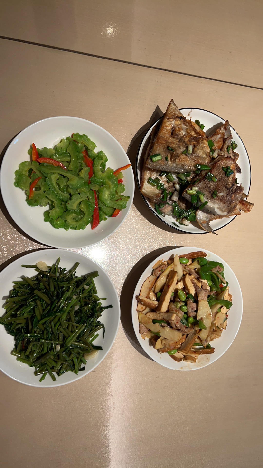 干煎鲳鱼,空心菜,苦瓜,豆腐干春笋毛豆肉丝