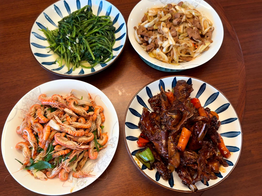 酱鸭🦆、葱爆羊肉、姜葱炒鼓虾&蒜蓉空心菜