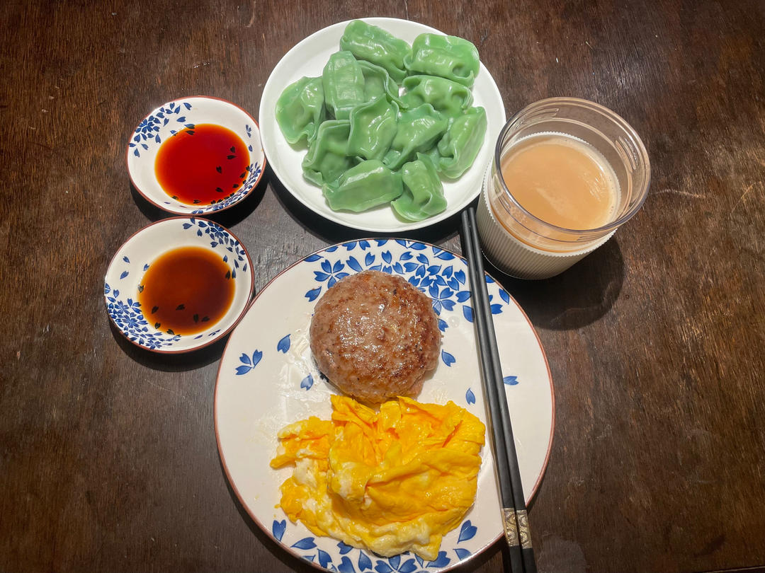 老公早餐:菠菜饺子、煎鸡蛋、汉堡牛肉饼和燕麦咖啡☕️