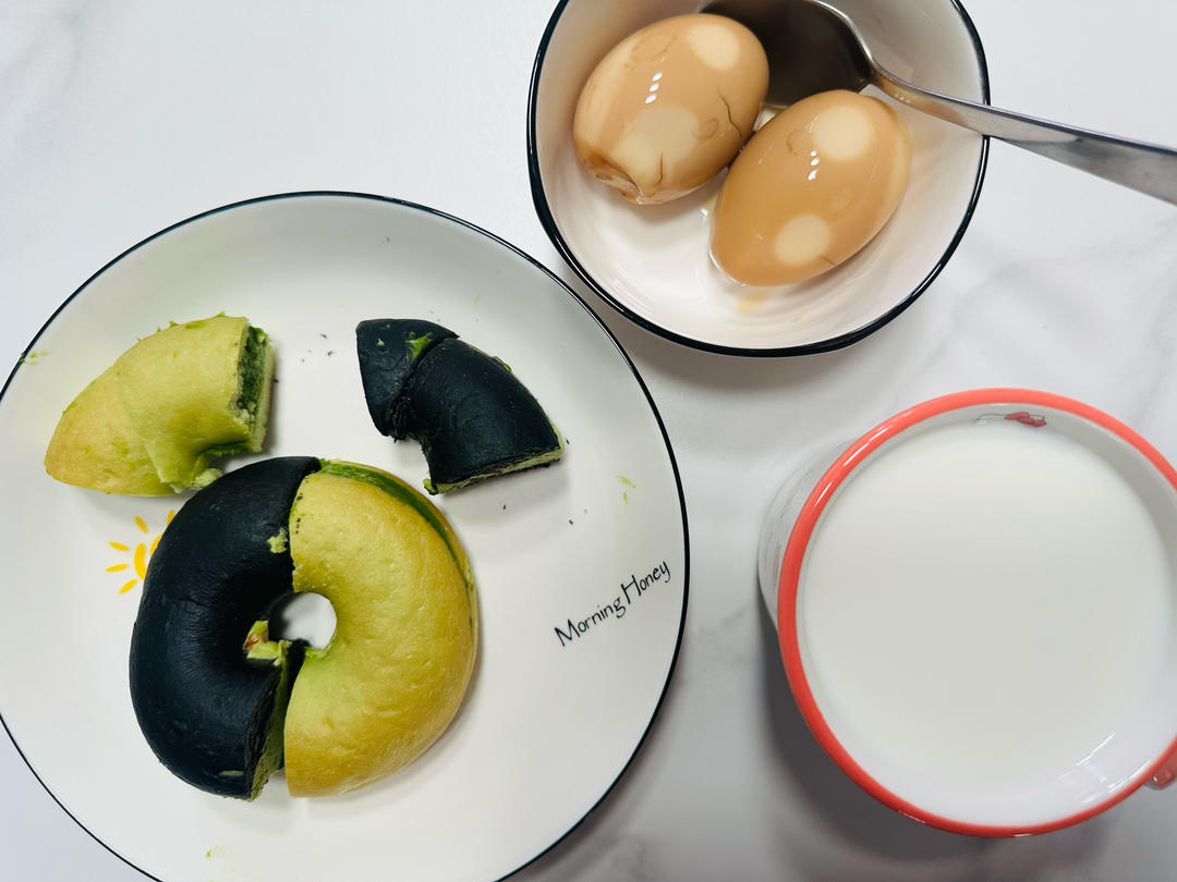 tims开心果贝果,抹茶贝果,茶叶蛋,牛奶