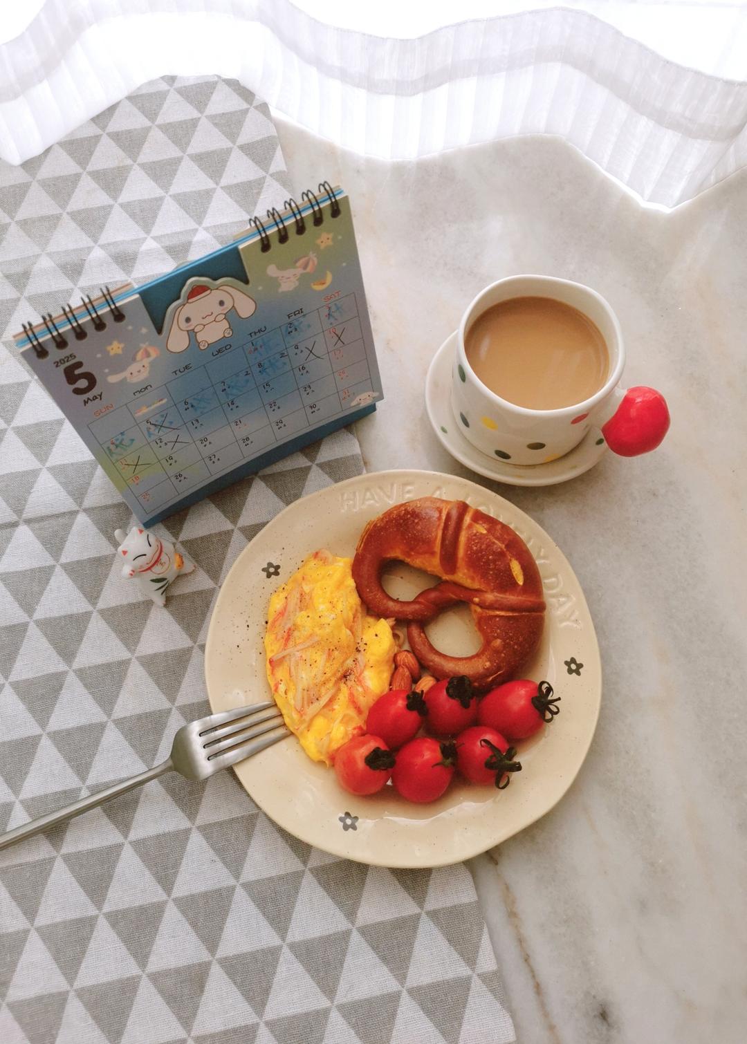 咖啡☕,蟹柳滑蛋,德国结碱水...