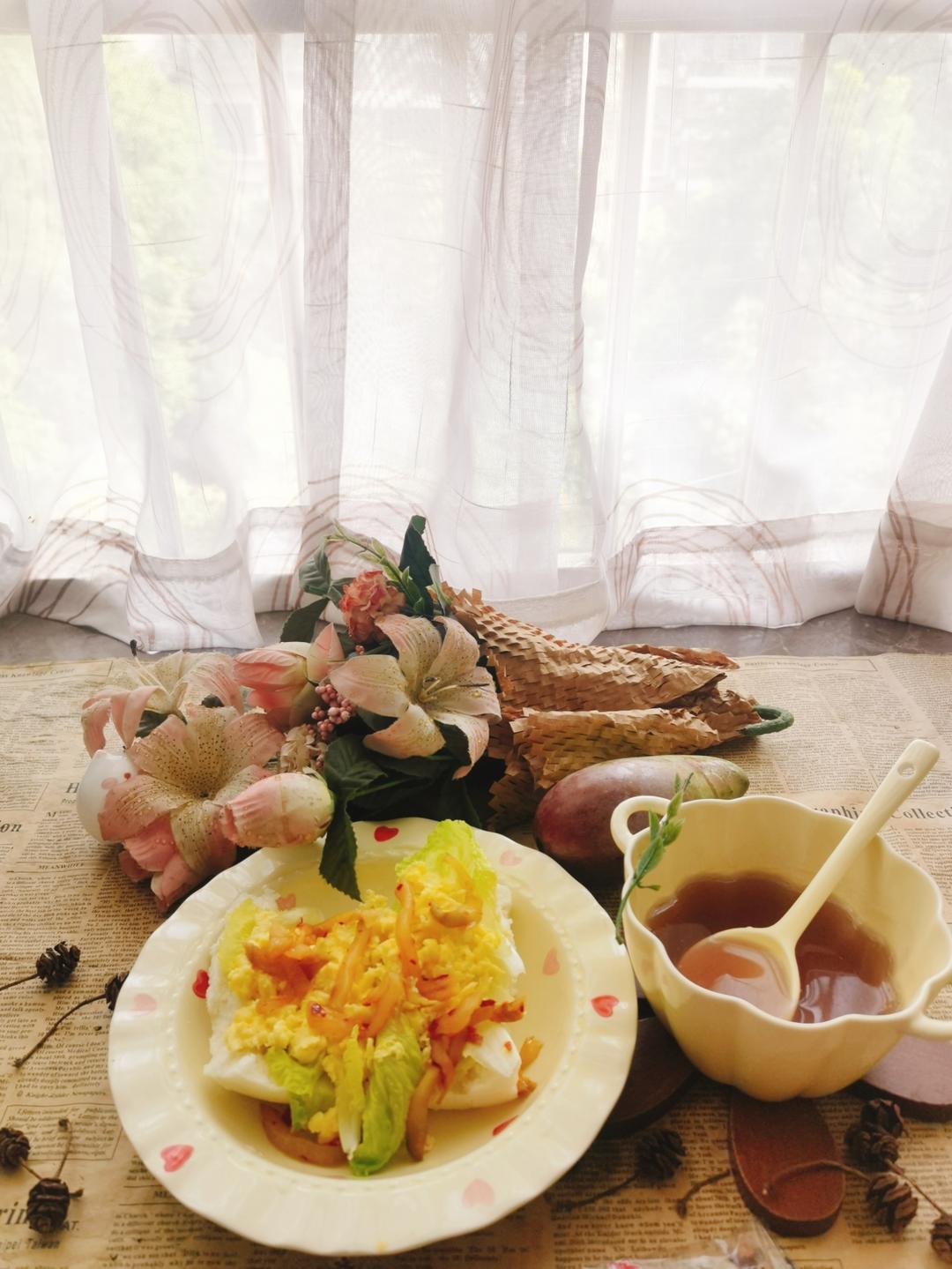 🌸半个白馒头夹上生菜,鸡蛋,榨菜丝做成中国汉堡,搭配一杯藕粉,妥妥的~