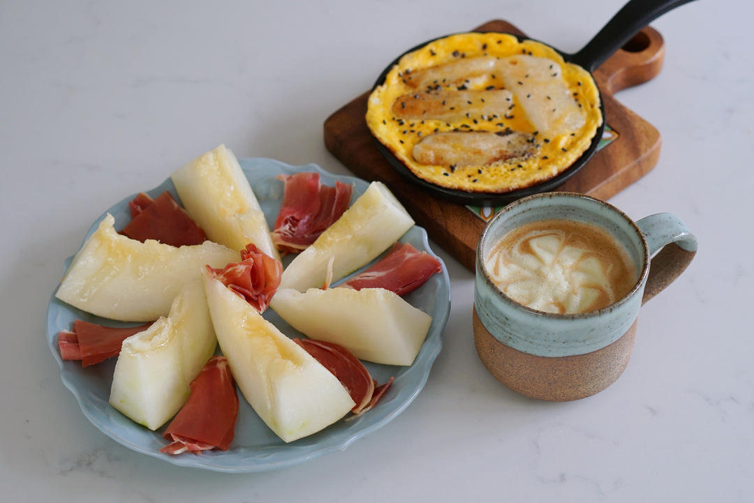 学的抱蛋日式年糕,西班牙火腿哈密瓜🍈以及一成不变的姜黄豆浆拿铁。