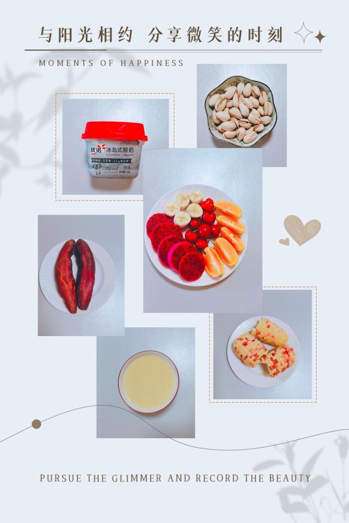 酸奶,蒸玉米🌽小米粥,蒸红薯🍠开心果,水果🍊🍌🍒
