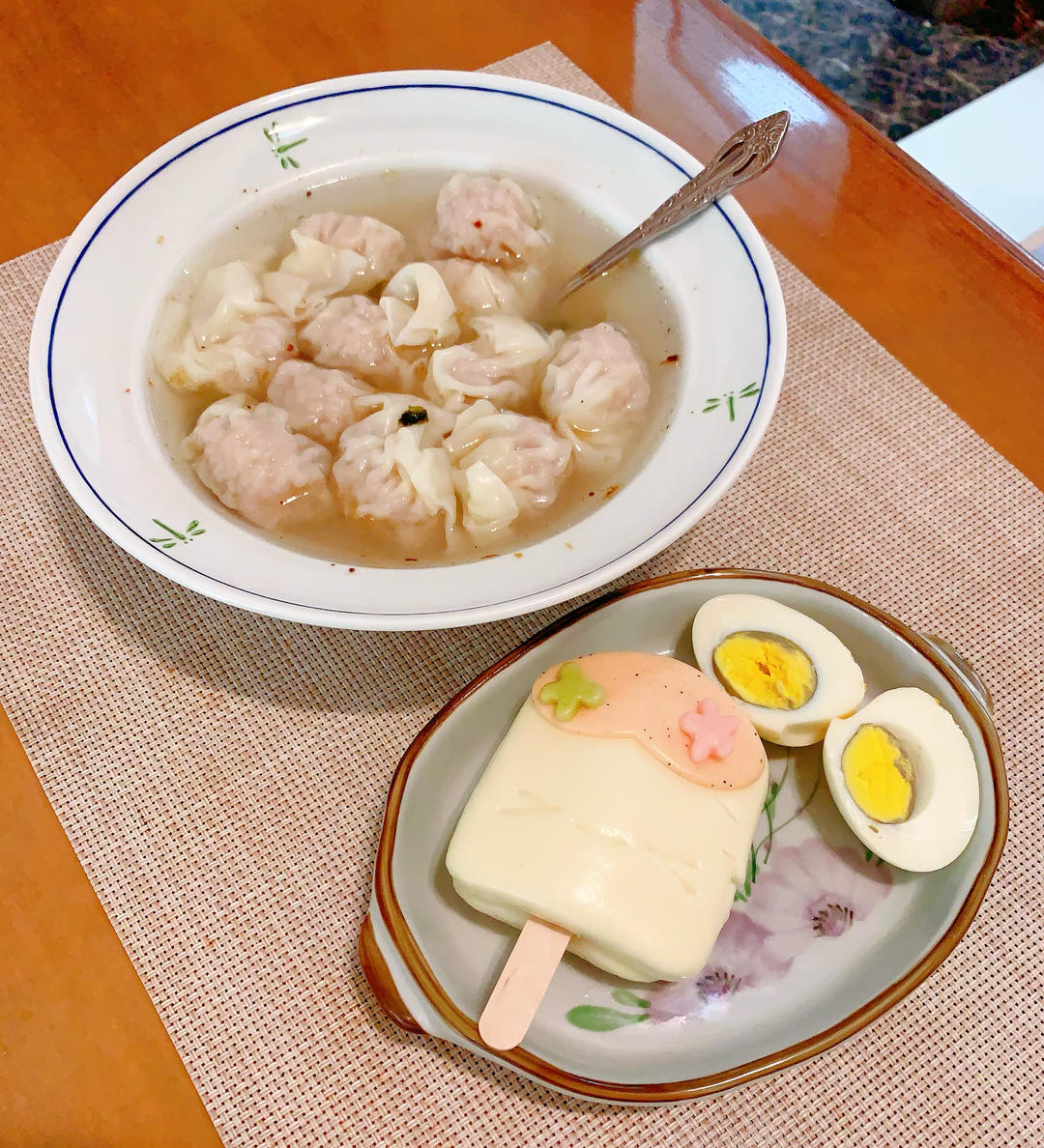 早上不用起那么早了随便吃了点。中午做了馄饨、卡通小馒头