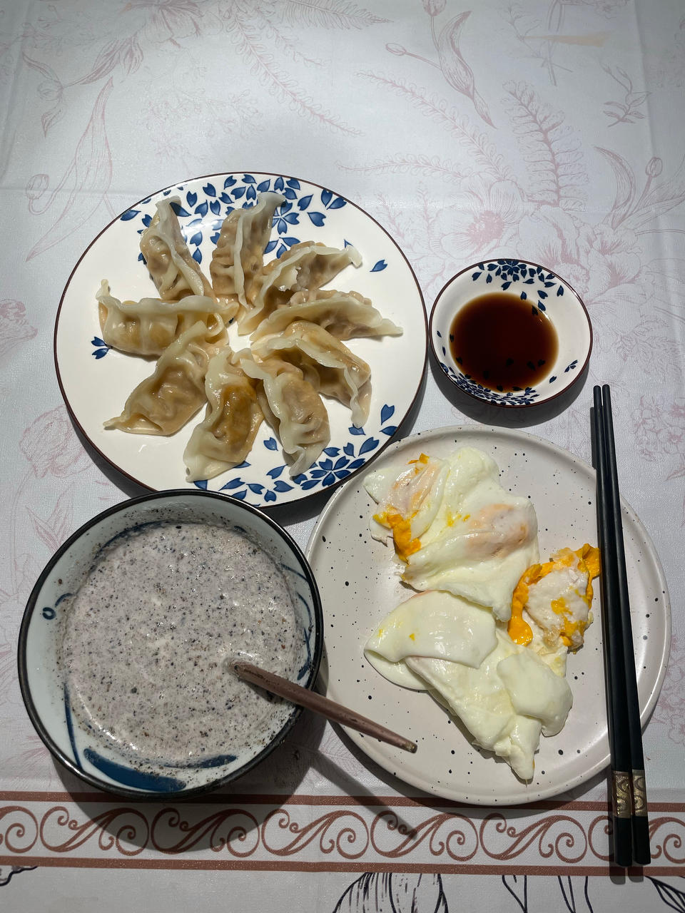 老公早餐:煎饺、荷包蛋和牛奶芝麻。
