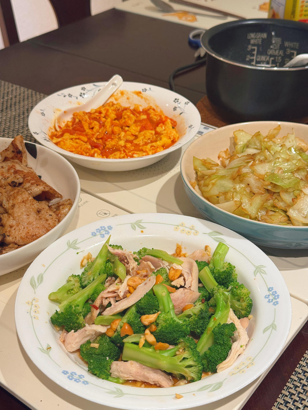 金针云耳冬菇蒸牛腱,榨菜蒸豆腐,肉末炒苦瓜,炒油菜