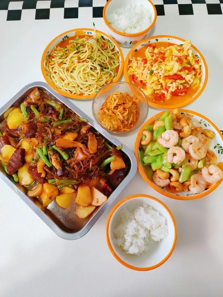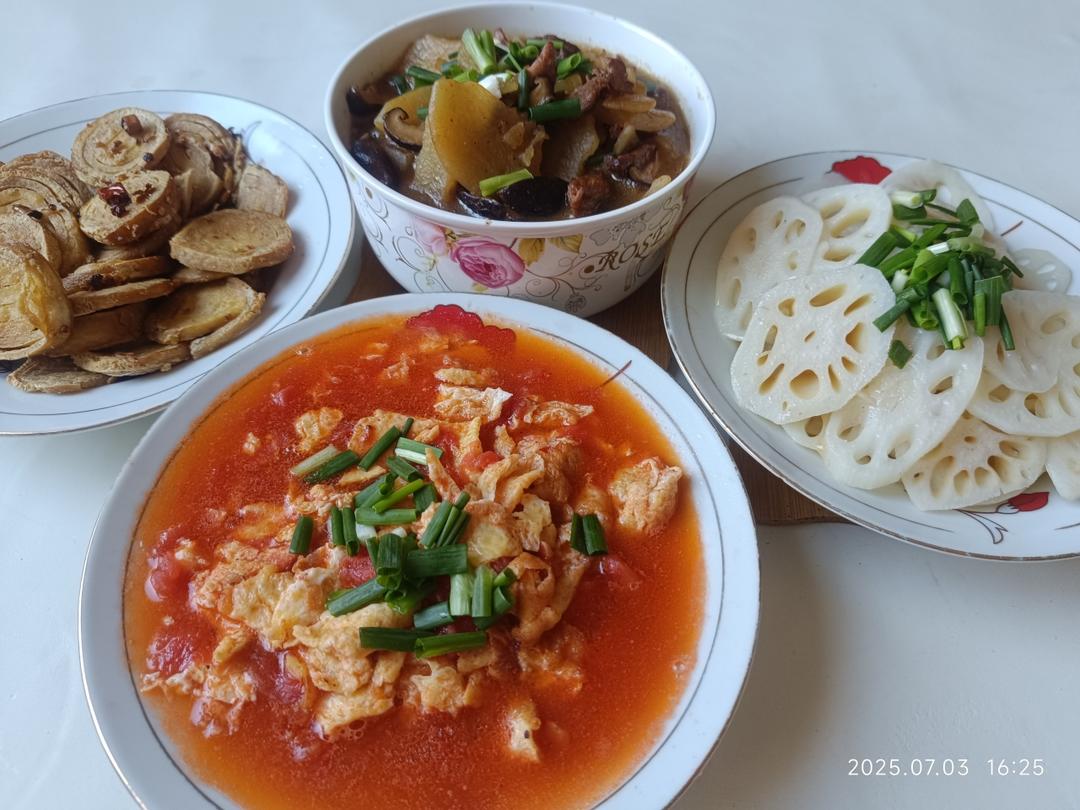 晚餐•2025年7月3日,滑藕片,番茄炒蛋,干煸霉千张筒,香菇土豆烧肉!
