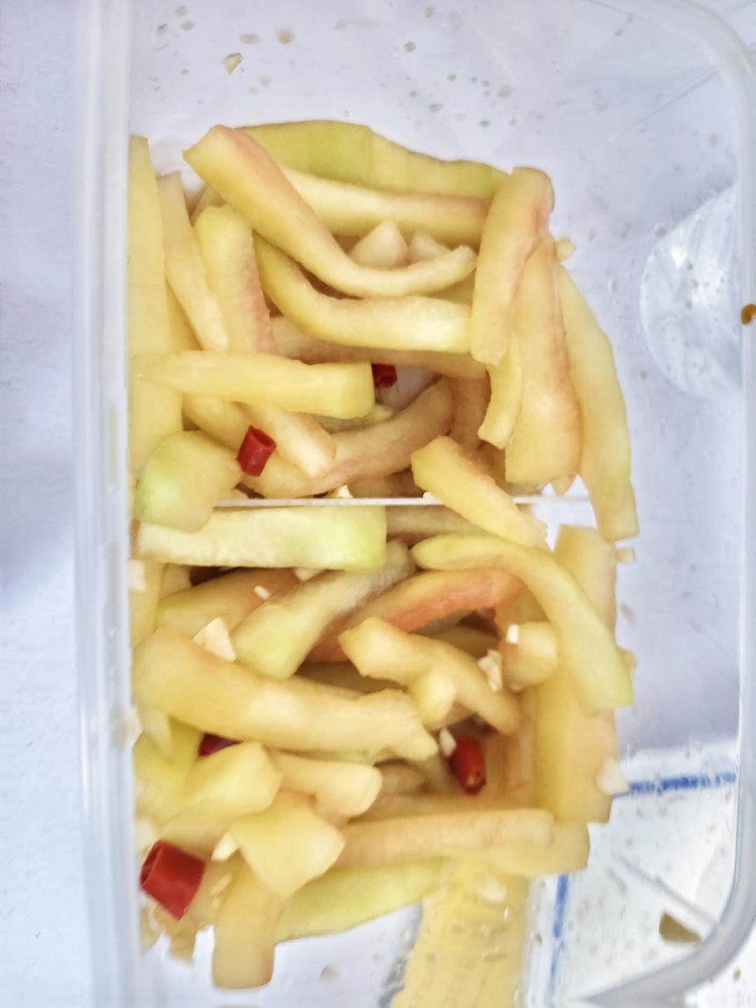 瓜皮冷藏一小时就做了,做完就开始吃了[我是急急国王]没放辣椒面,而且料汁拿矿泉水冲淡了一点,不过还是很好吃哒,酸甜辣爽口...