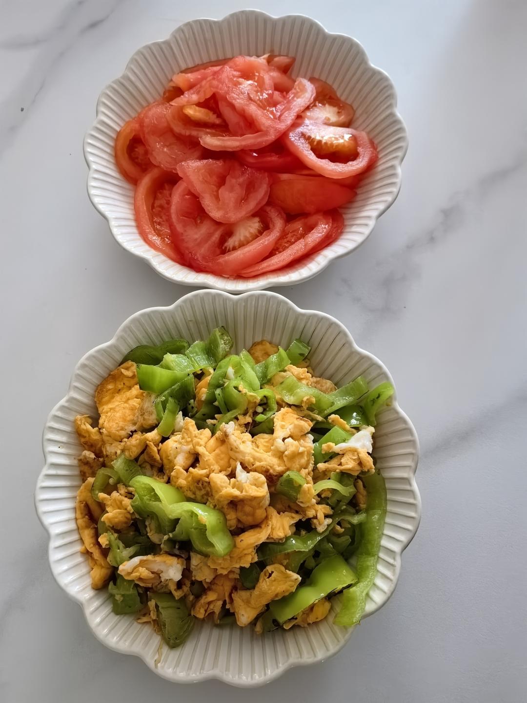 凉拌番茄、青椒炒鸭蛋+梅干菜饼