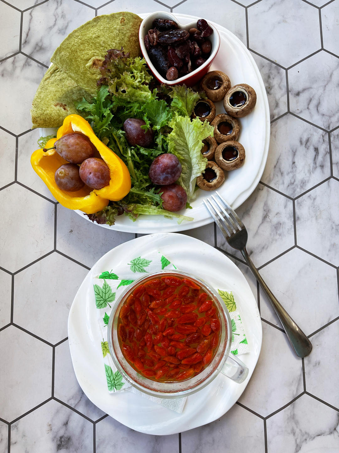 工作日早餐:杂蔬+烤蘑菇+彩椒+西梅+杂豆+菠菜卷饼+枸杞水。