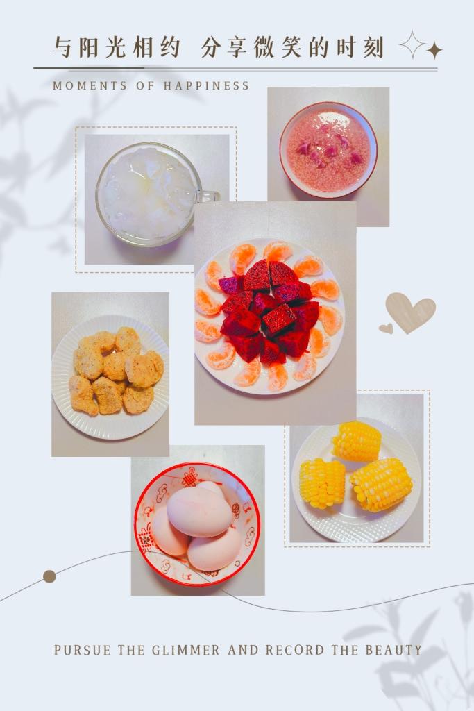 珍珠蜂蜜梨炖银耳,紫薯小米粥,炸鸡块,水煮蛋🥚蒸玉米🌽水...