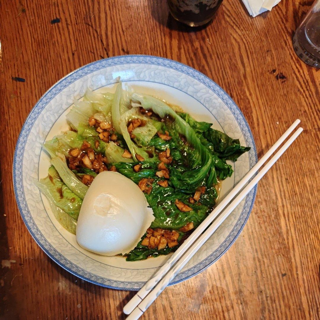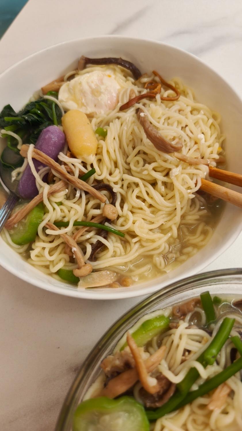 荷包蛋地瓜叶丝瓜菌菇鸡汤面