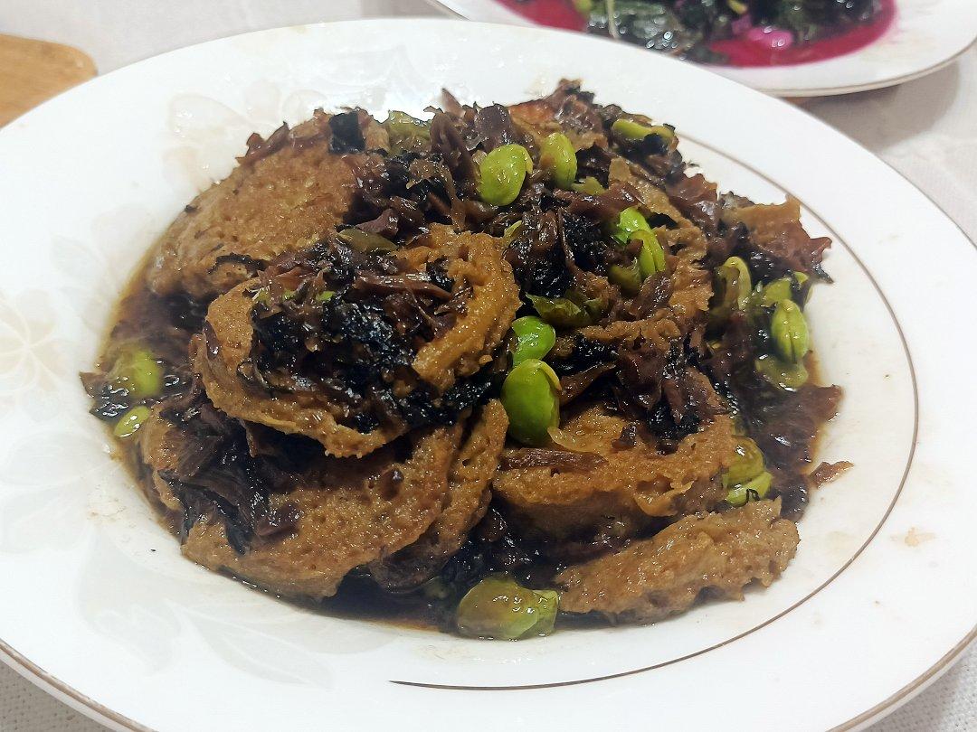 素鸡的处理方法一样,用的是笋干菜烧素鸡。