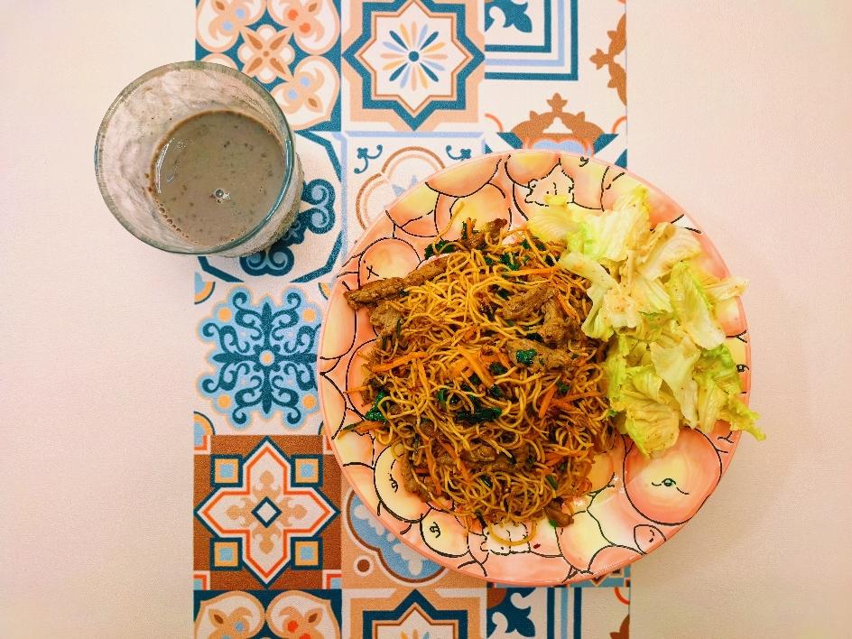 Day467.港式牛肉炒面+生菜沙拉+五黑饮