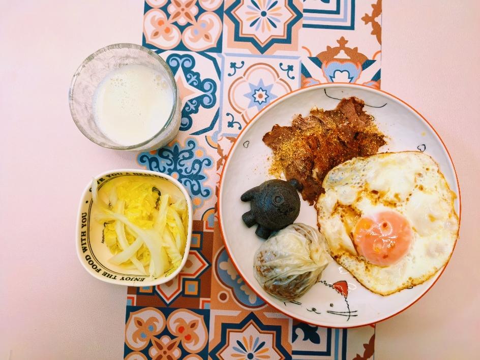 Day469.烧麦+黑米糕+黄油煎蛋+卤牛肉+白菜+豆浆
