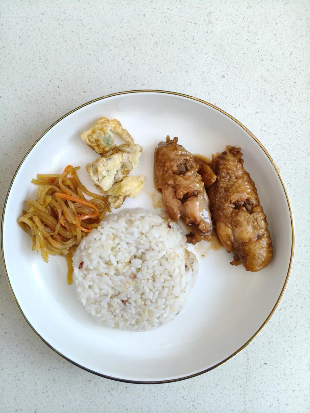 周四早餐 : 可乐鸡翅+胡萝卜土豆丝+小葱炒鸡蛋+米饭