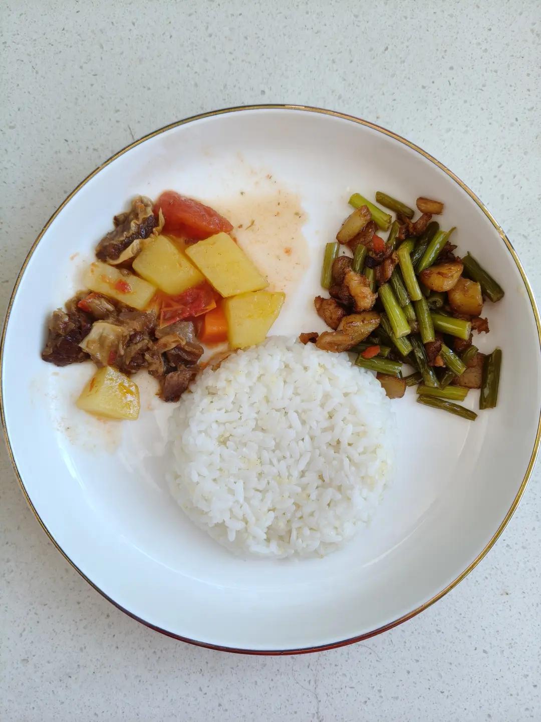 周五早餐 : 牛肉柿子土豆+蒜薹炒鸡肉+米饭