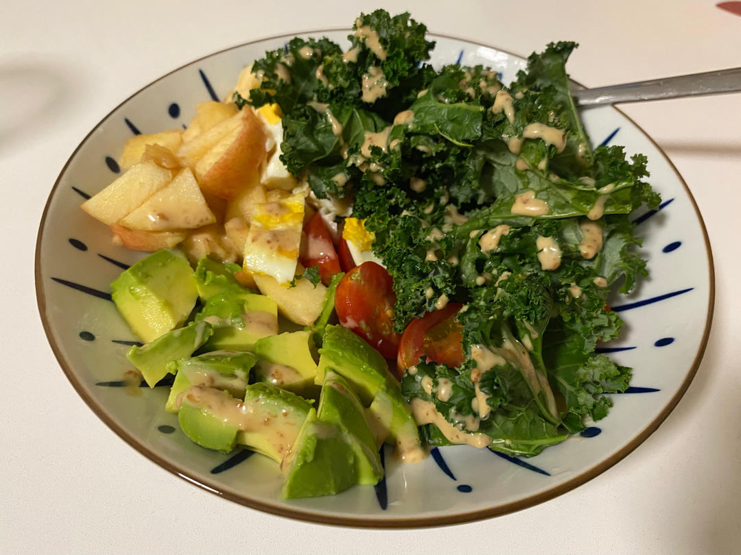 第一次尝试自己做羽衣甘蓝,吃起来很锻炼咬肌🤣淋的芝麻酱中和了苦涩味。整体来说还不错