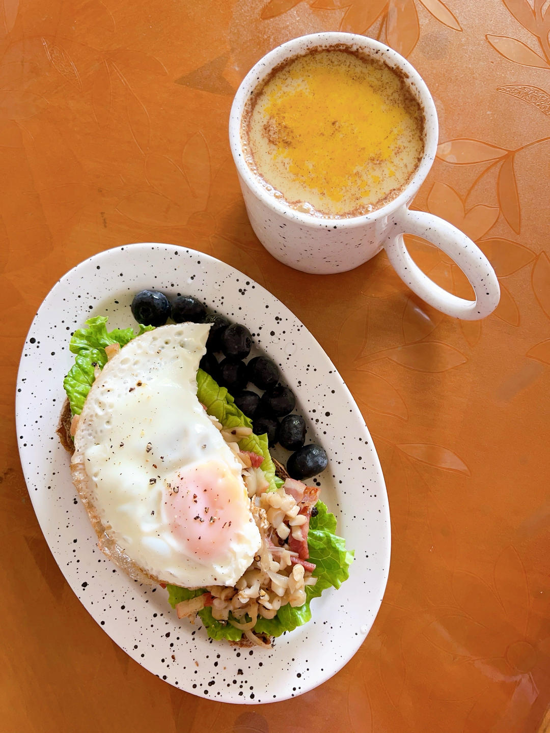 煎蛋🍳培根炒蘑菇欧包,蓝莓🫐,姜黄豆浆饮