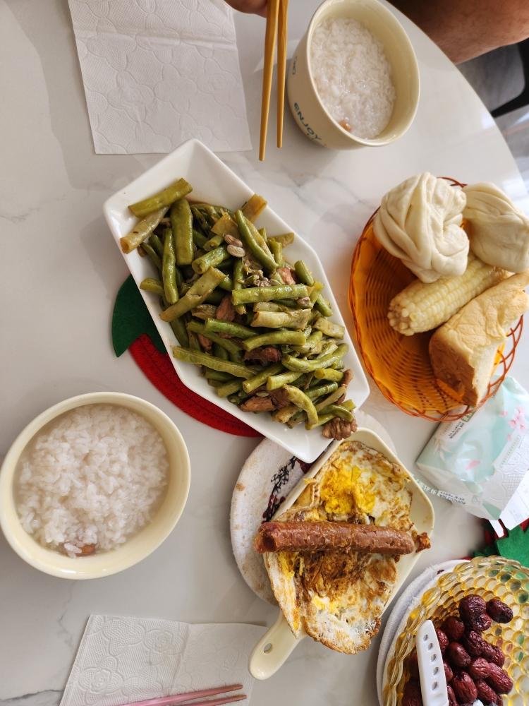 炒豆角,大米粥,煎鸡蛋🍳
