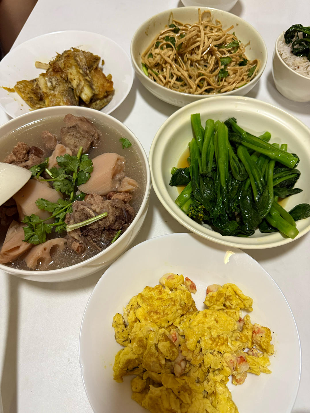 蒜茸西兰花,辣炒花甲,茭白炒肉,上汤杂烩菜。杂烩菜是用中午吃火锅的剩菜做的,每样剩了一点...
