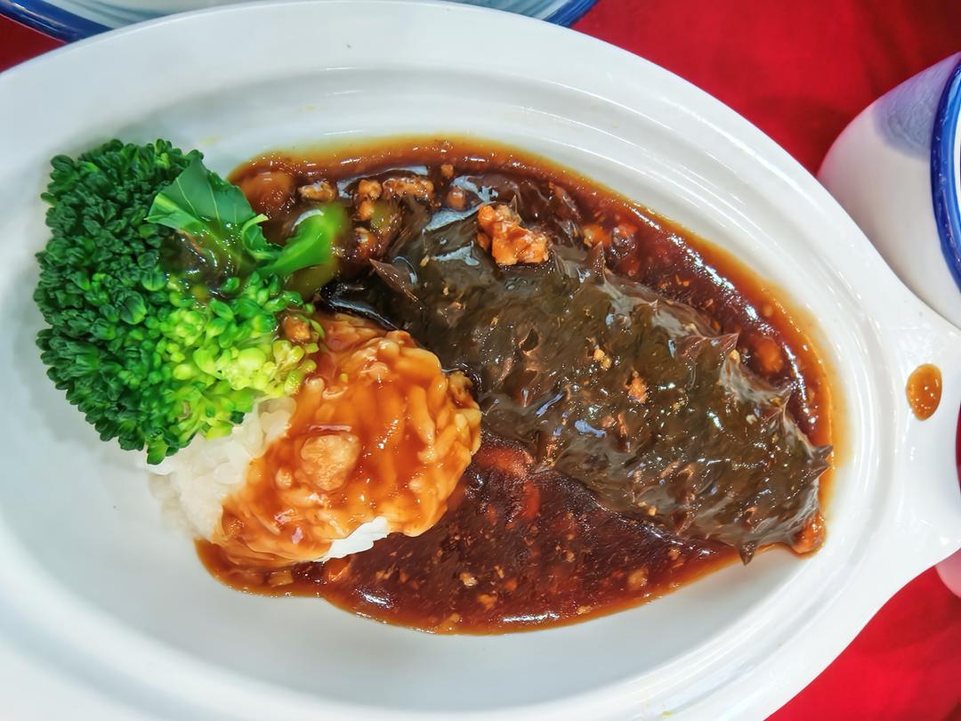 海参捞饭,我吃了三根海参。因为闺女和老妈觉得没入味,而且滑不溜丢的不爱吃,但是又太贵,不舍得浪费,都给我了。#我的青岛吃...