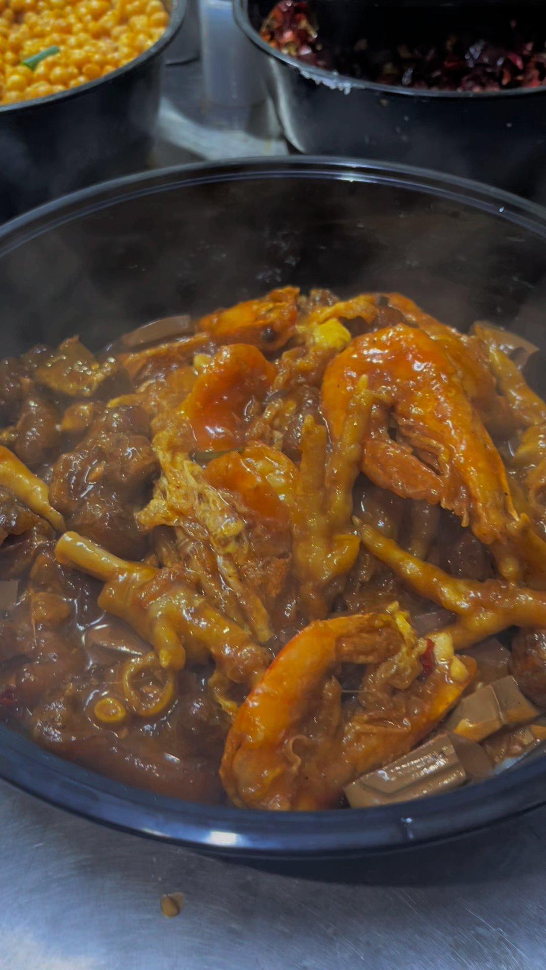对于胖哥俩的蟹肉煲,赖胖子的牛蛙煲,我更喜欢这款收汁超级入味的秘制虾蛙鸡爪猪蹄煲~