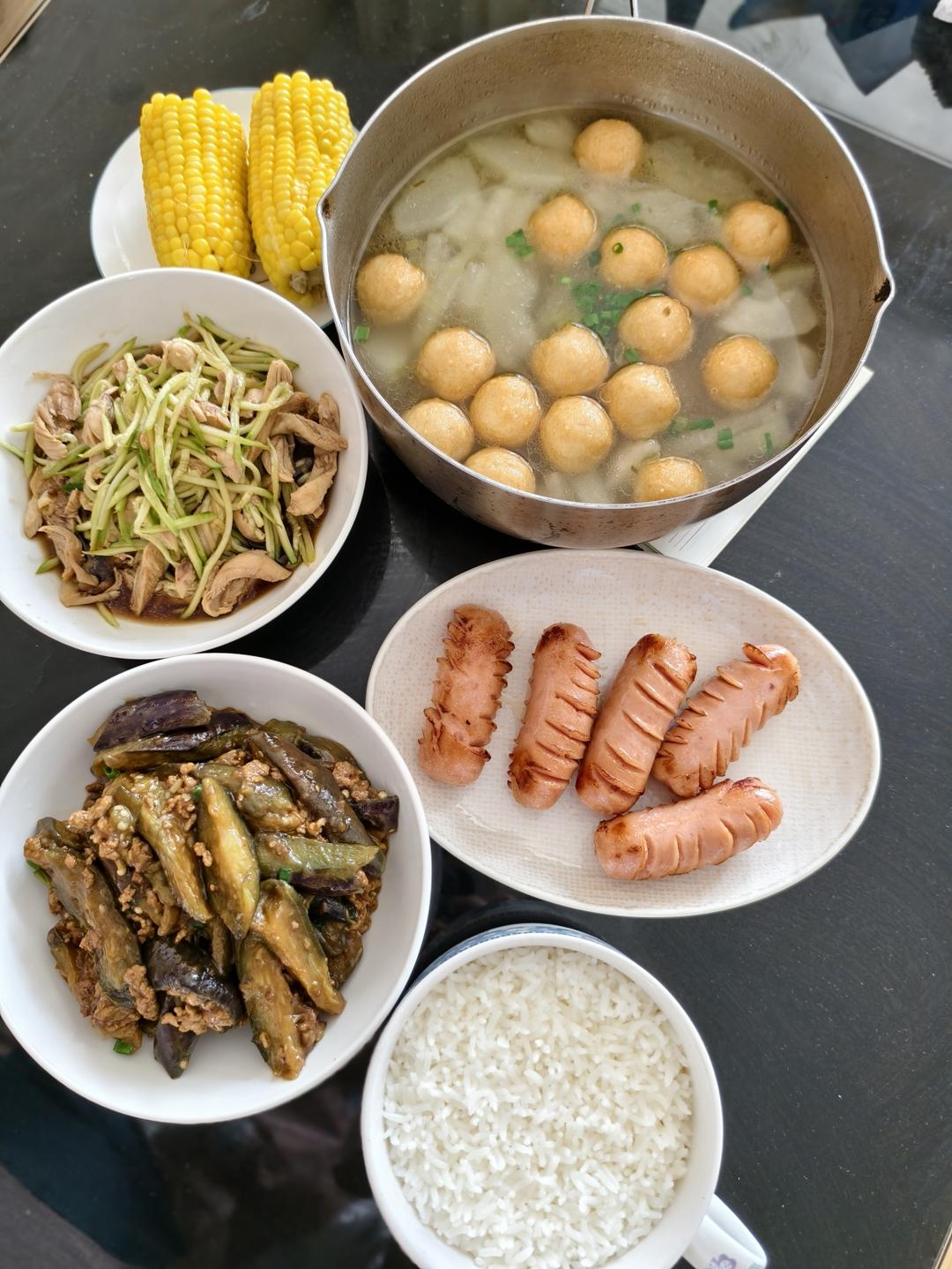 米饭,烤肠,肉沫茄子,鸡肉拌黄瓜,冬瓜丸子汤,玉米