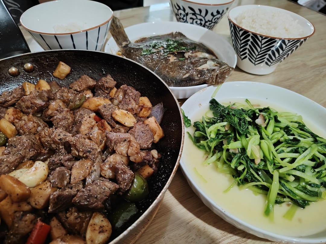 10.18午餐!黑椒杏鲍菇蒜子牛肉粒~清蒸多宝鱼~姜末青菜!