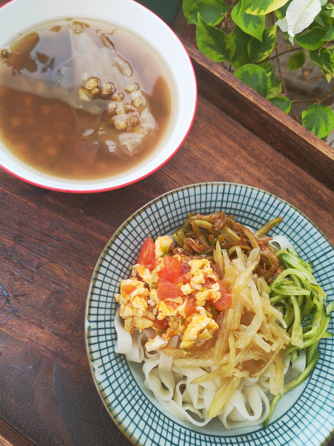 从小吃捞面条就是四个菜搭配着面条吃。四个菜基本固定:西红柿炒鸡蛋,炒土豆丝,肉丝炒豆角丝,凉拌黄瓜丝。