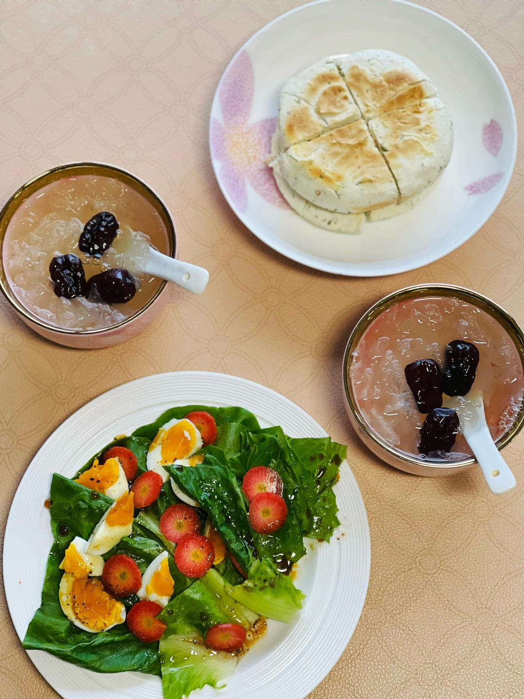 早餐:罗马生菜沙拉、椒叶白吉饼、冰糖银耳红枣粥。