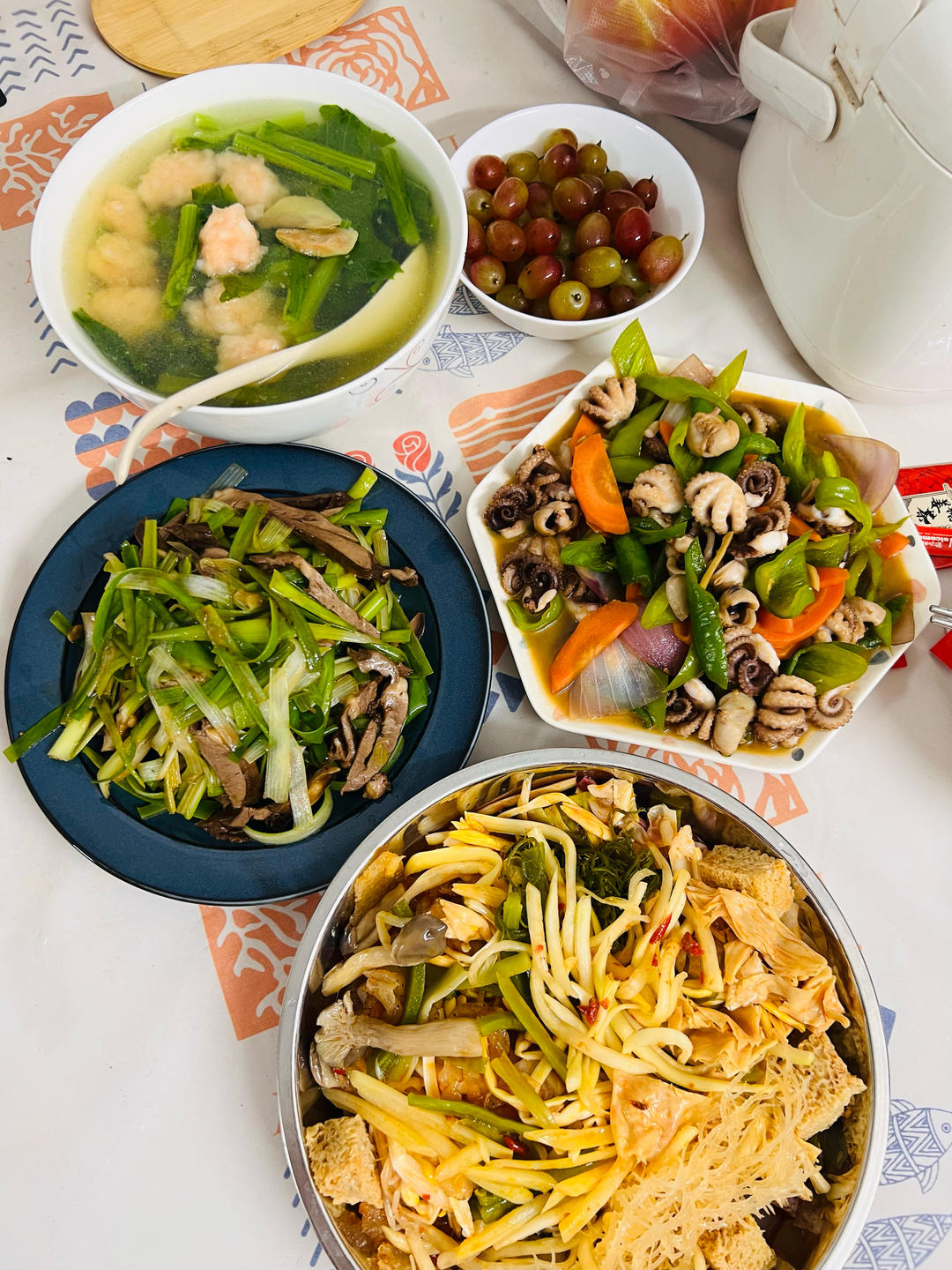 芥菜虾滑汤,炒八爪,炒卤猪心,凉拌菜