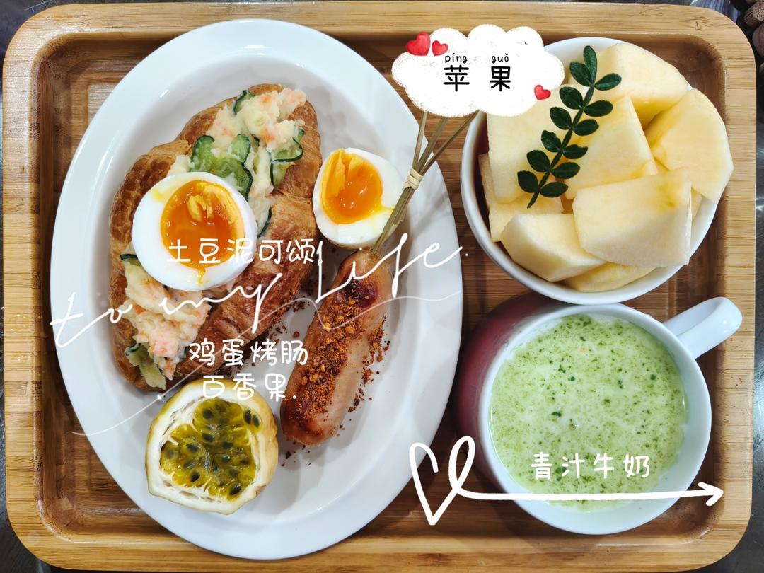 黄瓜胡萝卜土豆泥可颂、鸡肉烤肠、鸡蛋、苹果、青汁牛奶!
