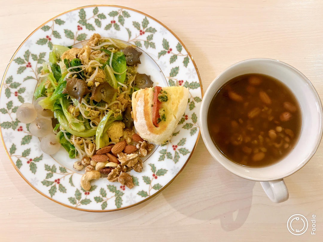 七珍润园粥➕蒜香火腿面包,鸡蛋炒生菜➕绿豆芽➕海参,坚果➕水果。