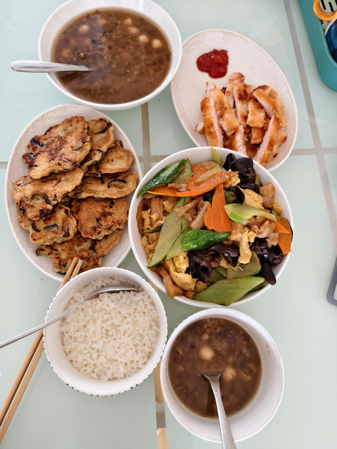 米饭,莲子红豆粥,黄瓜木耳炒鸡蛋,煎鸡排,煎茄子饼