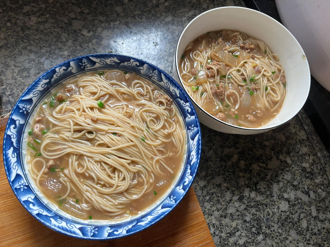 今天吃:洋葱肉沫炝锅面。洋葱多多,两人份半个洋葱,炒香,下肉沫,料酒酱油淋锅边呲一下,倒水下面。#午餐•2025年11月...