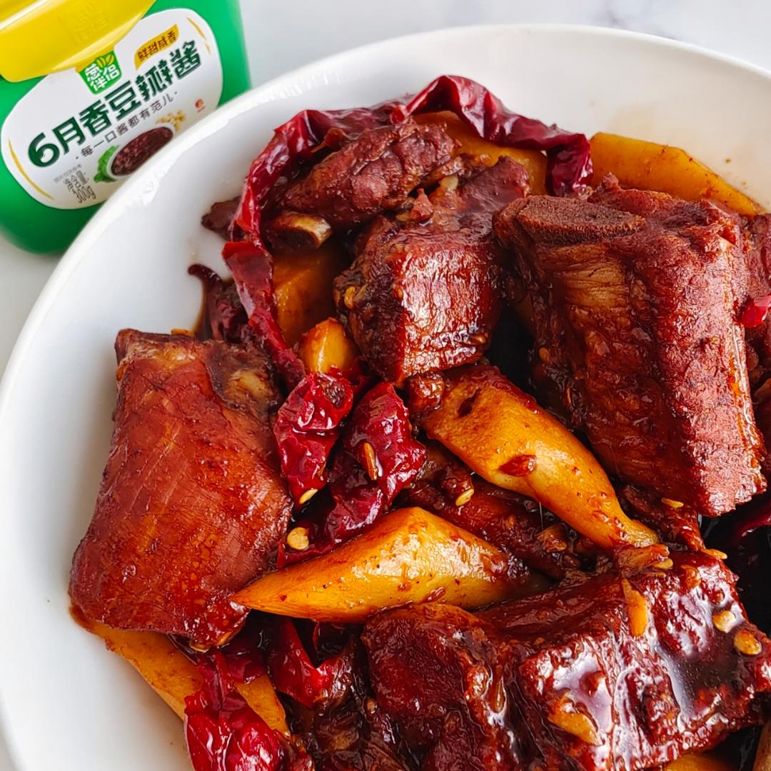 「豆瓣酱和辣椒就是绝配,油汪汪香喷喷的酱烧排骨,可以多吃一碗米饭了」