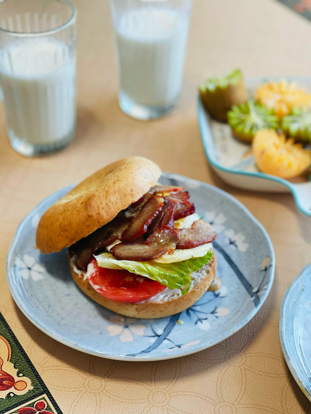 早餐贝果三明治有点巨无霸感,里面叠罗汉:番茄、厚切梨木烟熏火腿、罗马生菜、煎蛋、叉烧肉,两种酱和黑胡椒,喜欢吃肉的人表示...