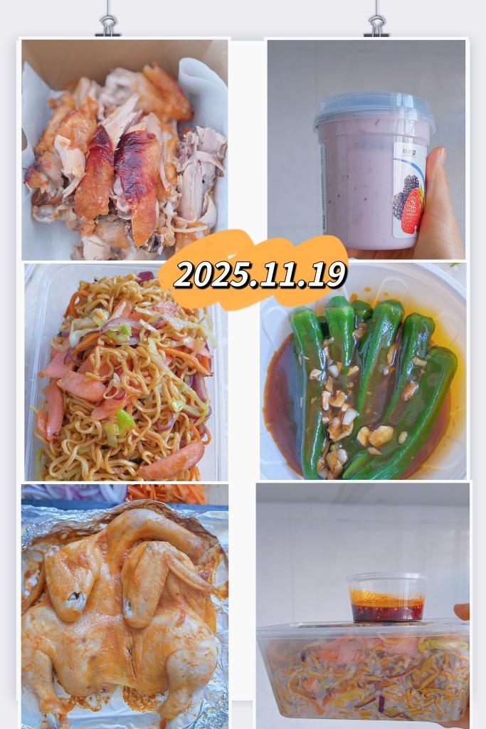 2025.11.19~炒面+奥尔良烤鸡+浇汁秋葵+酸奶。