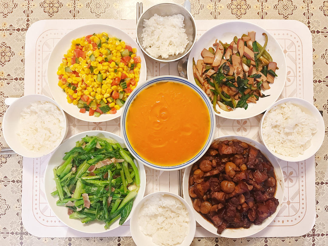 今日份:腊肉炒白菜苔,栗子烧五花肉,辣椒炒鸡蛋干,杂蔬炒玉米和南瓜羹。
