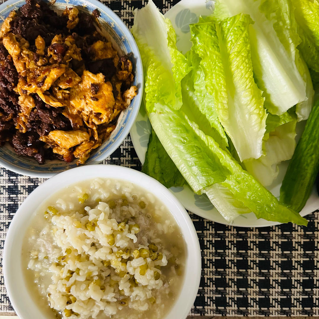 大米绿豆粥🥣罗马生菜,小黄瓜沾酱,挺好吃的,😀👍