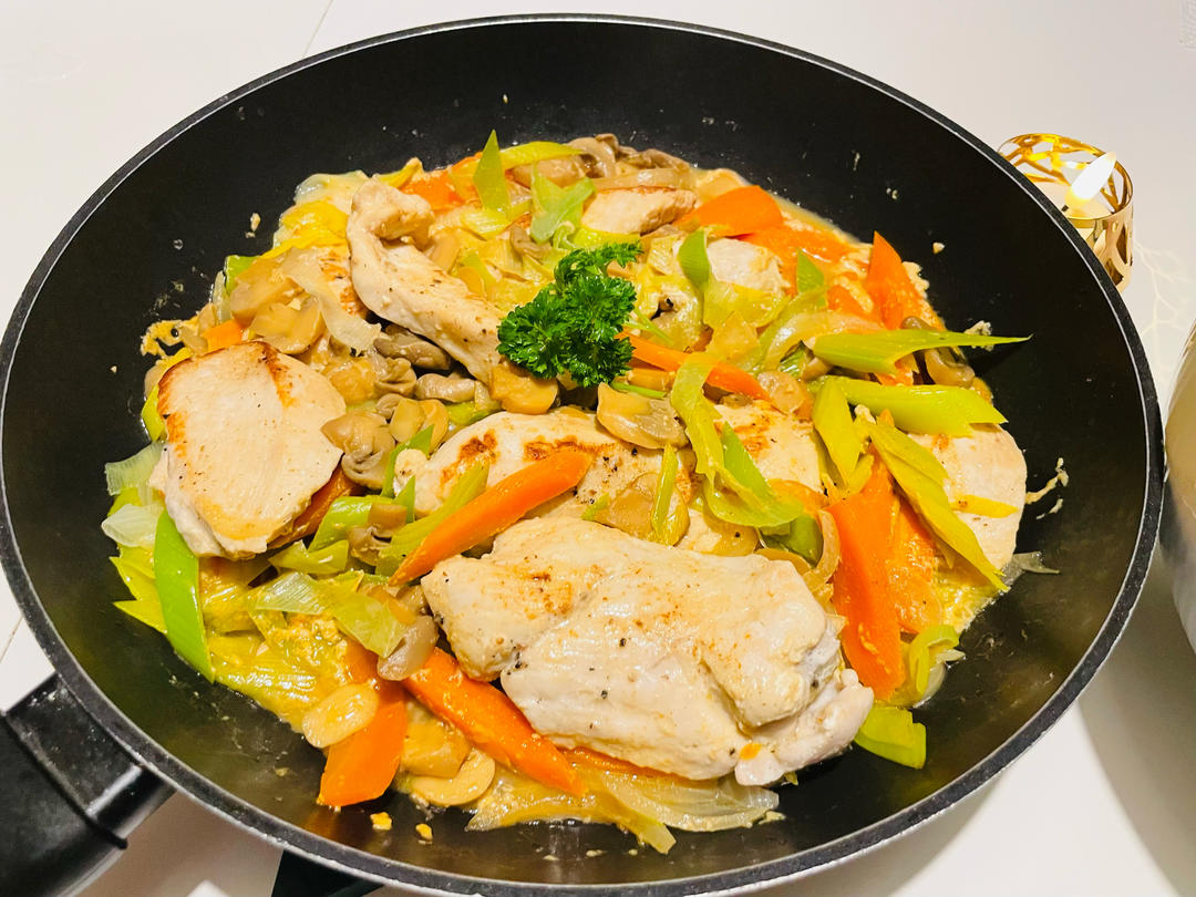 先煎了两个鸡胸肉,再倒入很多的蔬菜一起煮入味,再加一点paprika,味道很不错!😋 全家人都...