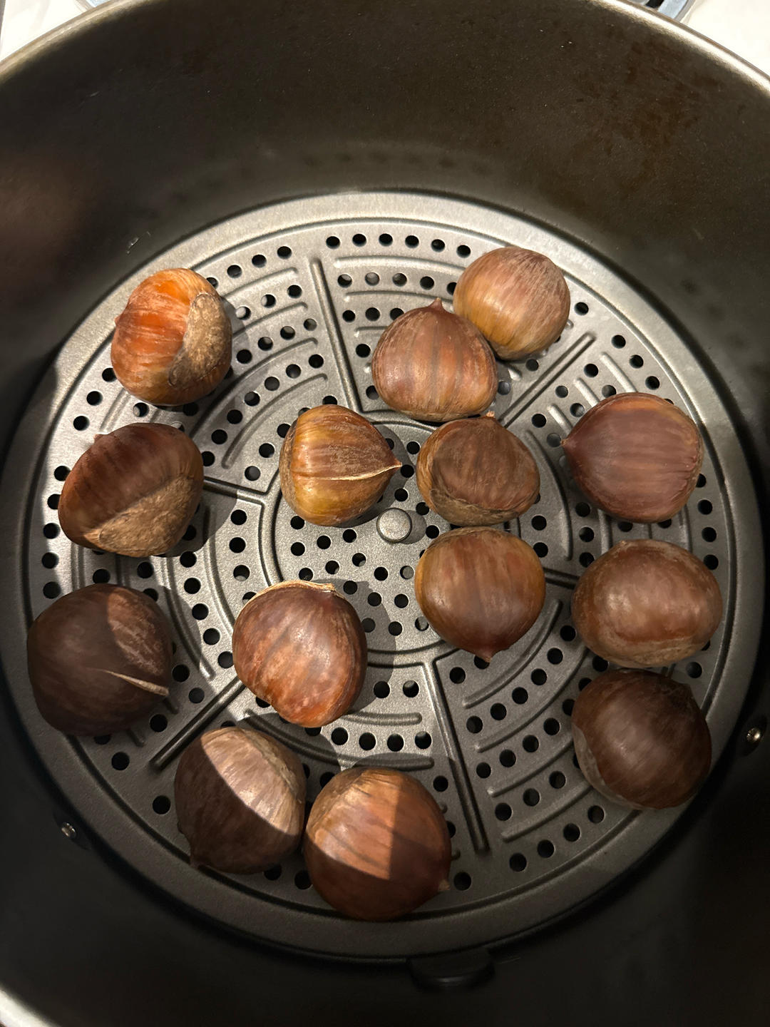 成功下车空气炸锅烤栗子,意大利的栗子🌰个大但不甜,正反面各150度十分钟,中间凉3分钟...