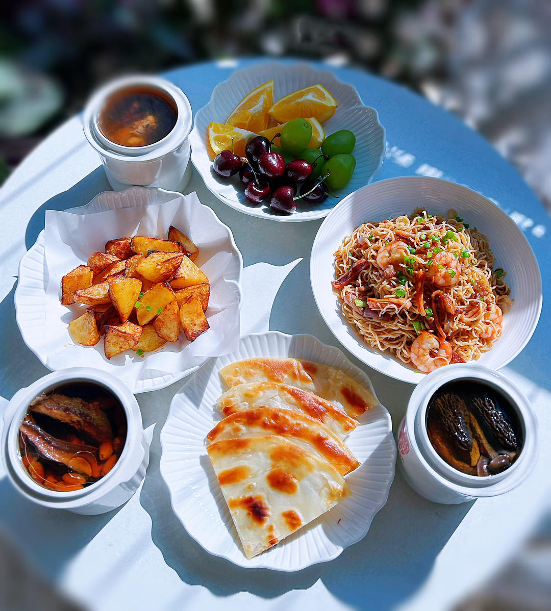 灵芝排骨汤、菌菇排骨汤、五指毛桃扁豆排骨汤、虾仁肉末炒面、烤薯角、手抓饼、水果拼盘