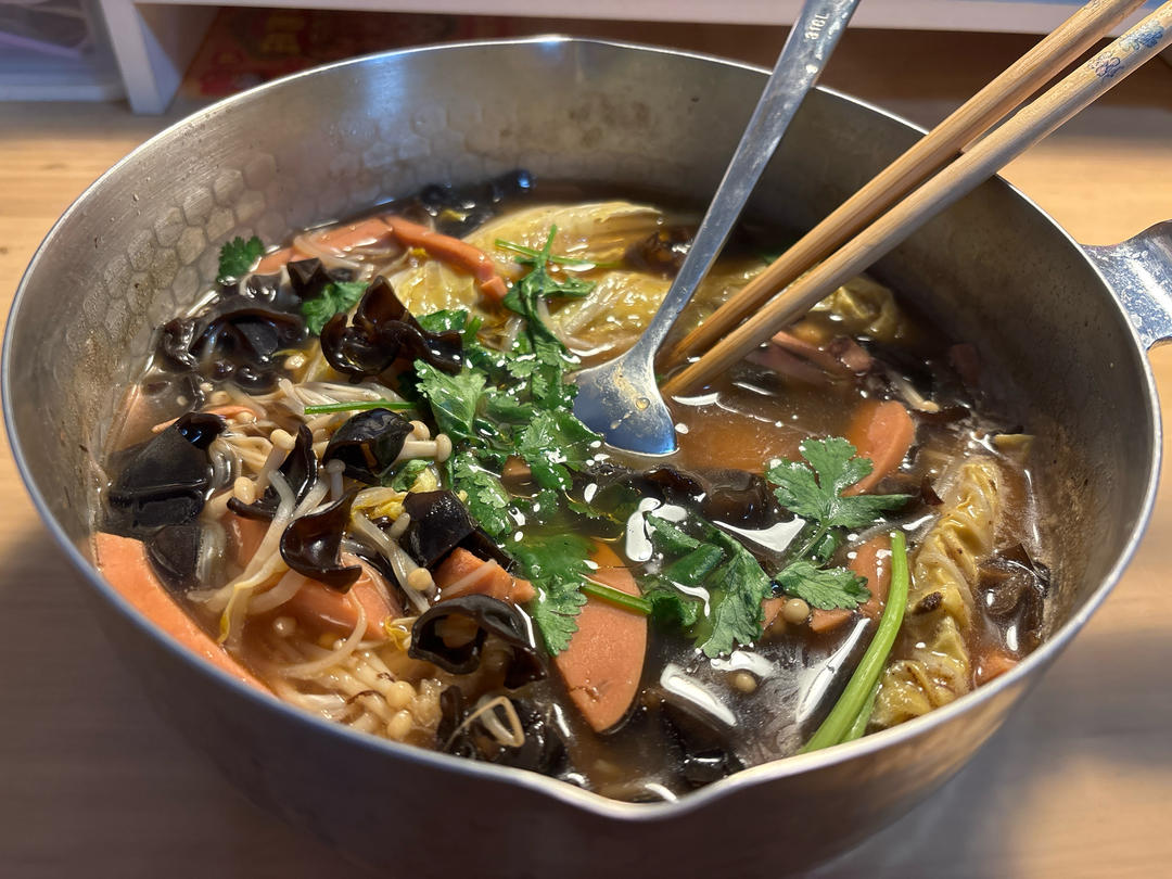 放了木耳、金针菇、豆芽、火腿肠、白菜,烩成一大锅!